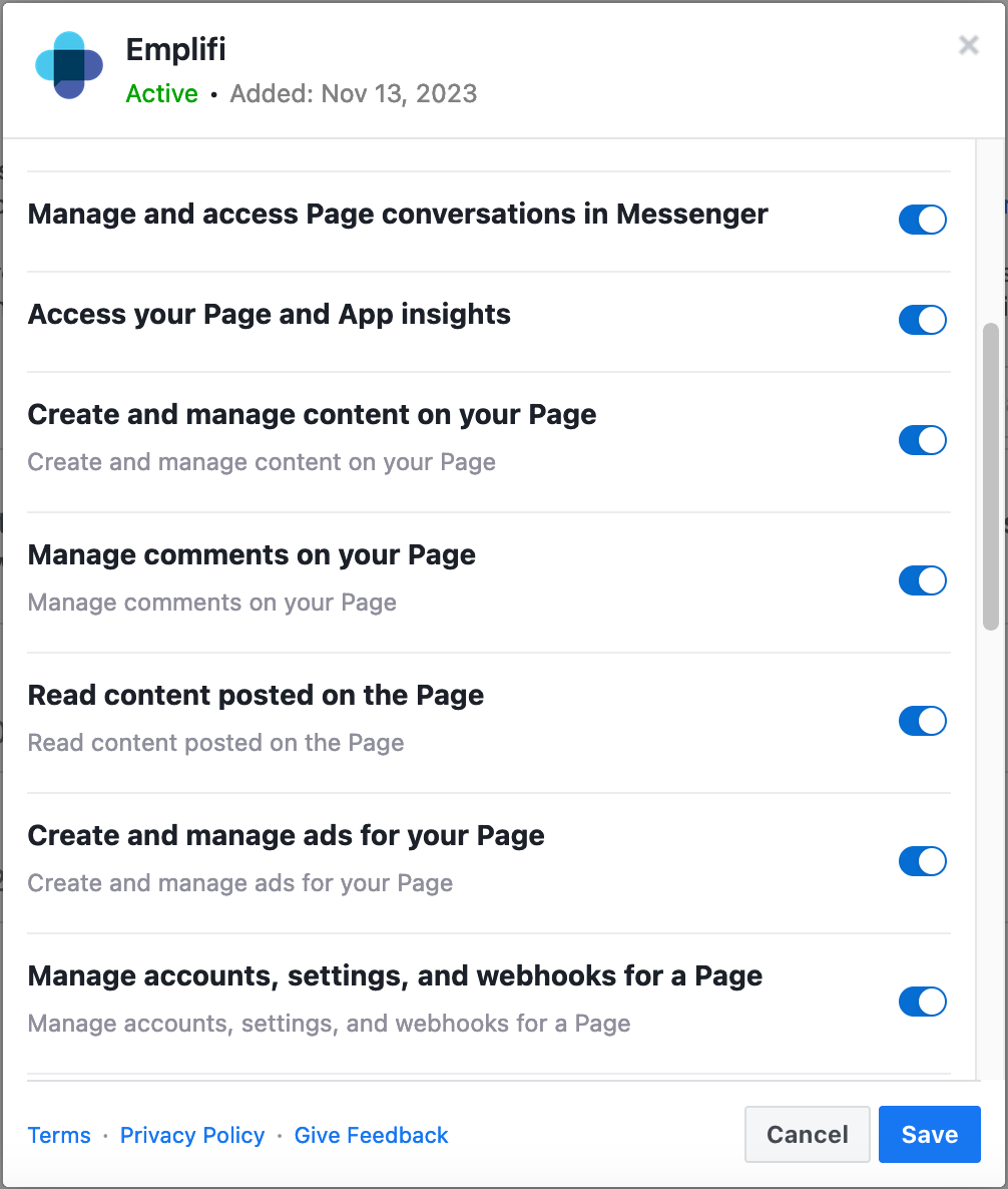 If you have already added Facebook pages to the Emplifi account in the past and Emplifi was added to your Facebook account as a business integration application, Emplifi must be granted access to the Facebook page that you currently want to add.