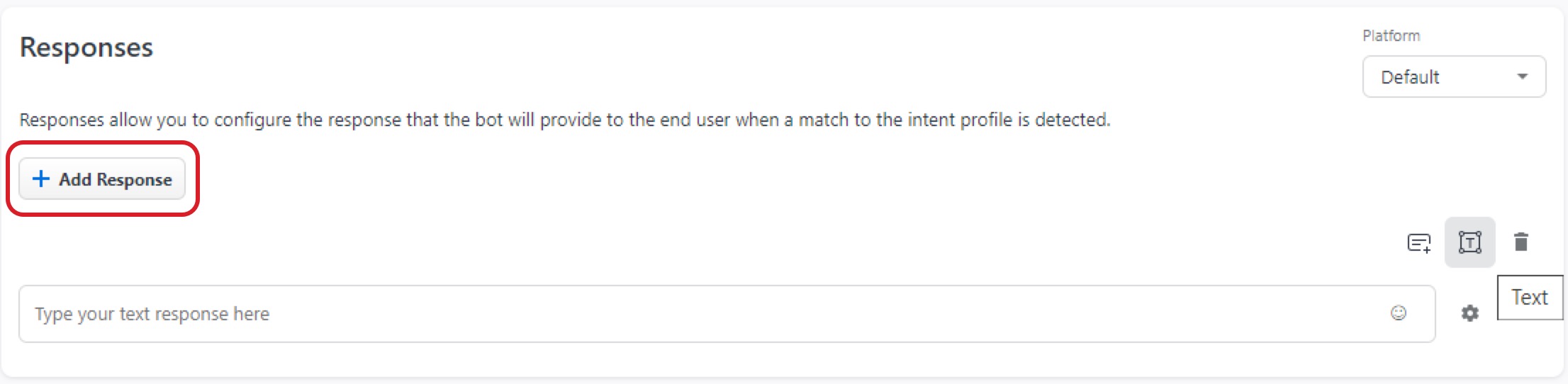 To add your first response, click Add Response. This creates a text response box for you, similar to what you created in the intent.
