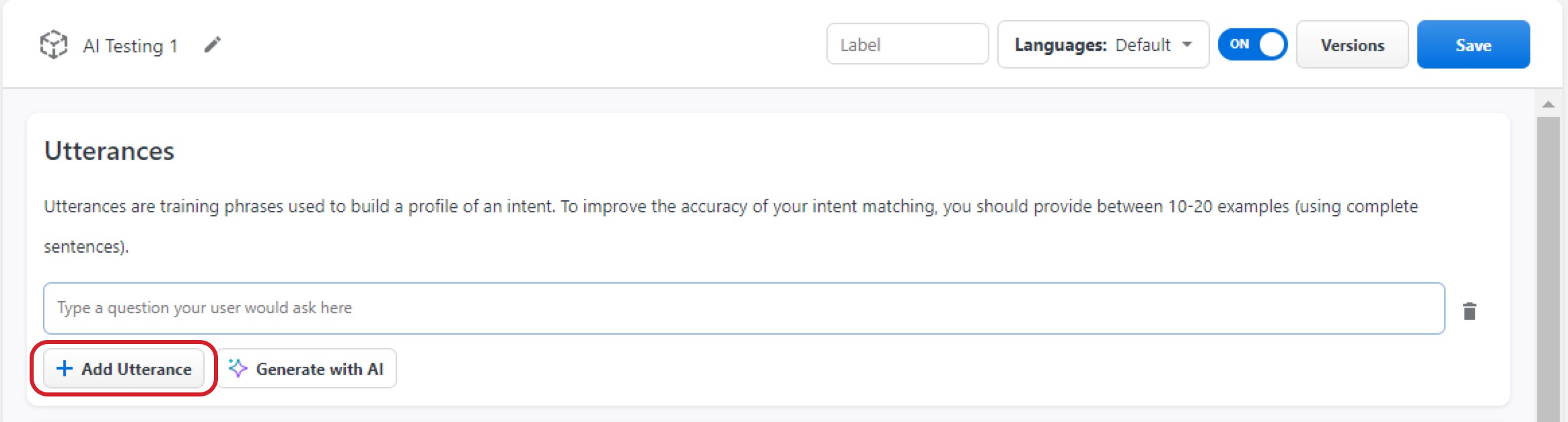 We recommend that you align the intent name with its purpose, eg. Refunds, Customer Help, etc.In the newly created intent, you will see a menu of options. Click Add utterance and follow the prompt text.