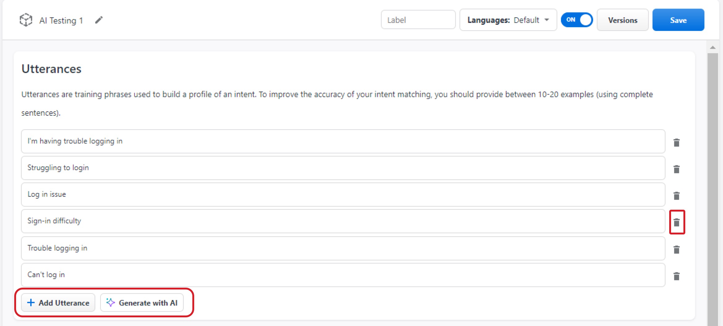 Delete any generated examples that do not meet your expectations or click Generate with AI again to create another five examples using all of the currently existing utterances as a prompt. This ensures that the examples will gradually become more accurate.