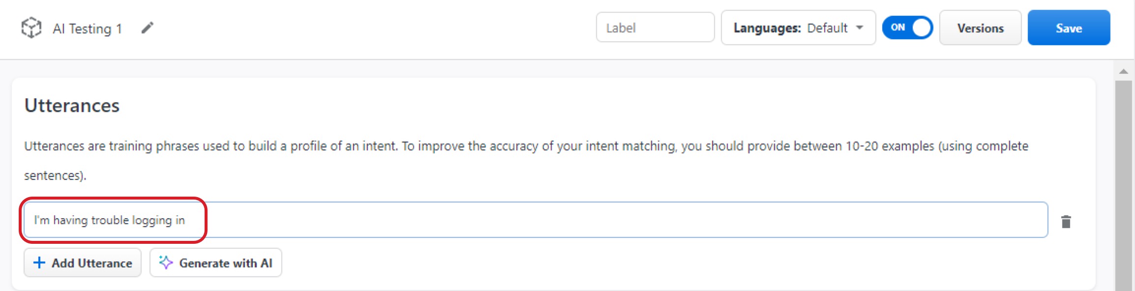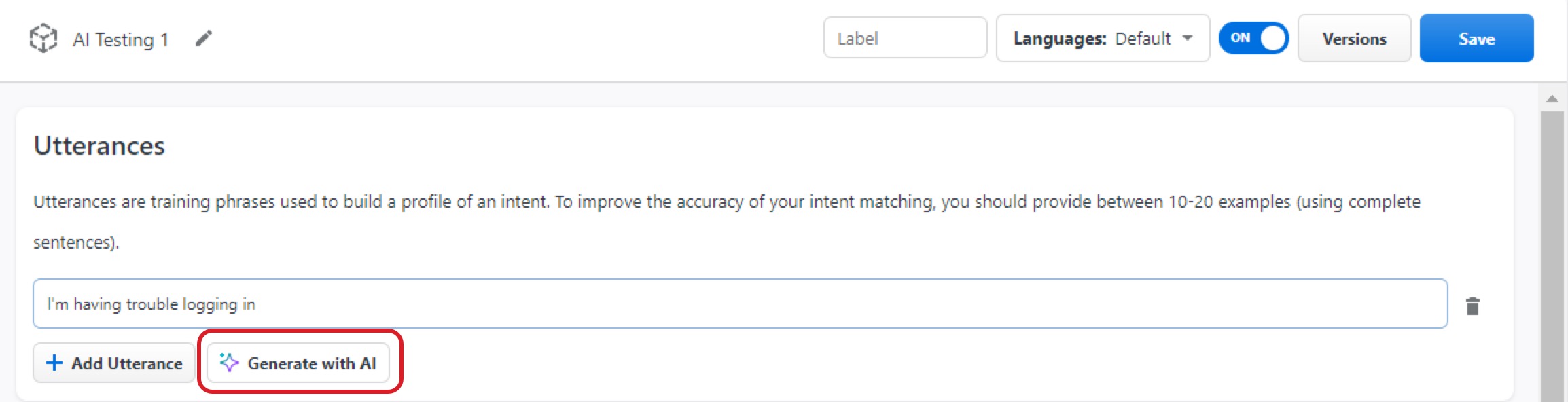 You must create the first example before you can use the AI to generate other examples, otherwise you will get an error message.Now that you have your first example utterance, click Generate with AI. This generates five examples based on your prompt, using a similar language and sentence structure.
