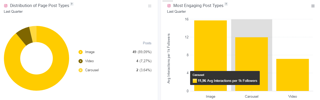 Look at your Distribution of Page Post Types and compare it to the Most Engaging Post Types to see if you should post more photos, videos or carousels. As those metrics are public, you can easily check what works for your competition and be inspired by their strategy, too. In the example below, this brand is posting more videos than carousels, although carousels are driving more engagement - a clear insight to tweak content strategy and post more carousels.