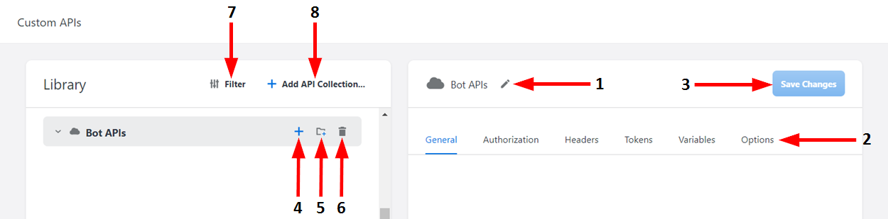 7 | Filter | Click here to open the Filter menu, where you can search the API Library for items or filter items by API Collection, Request, or Folder. |