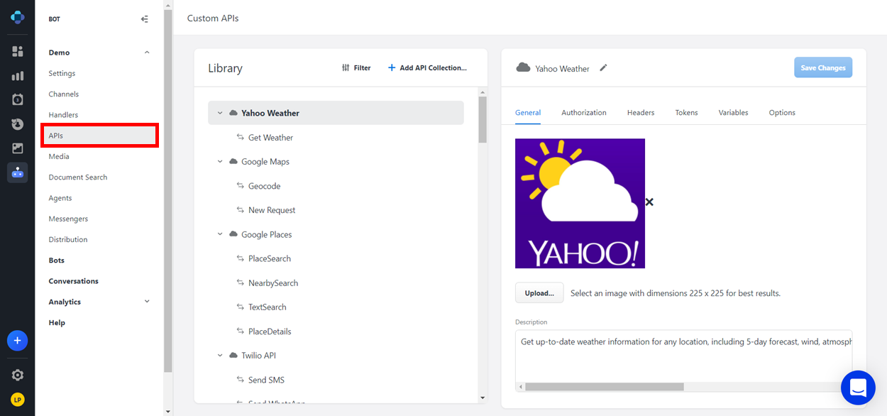 On the APIs page, you can add custom APIs for your bots. For more information, see Conversations.
