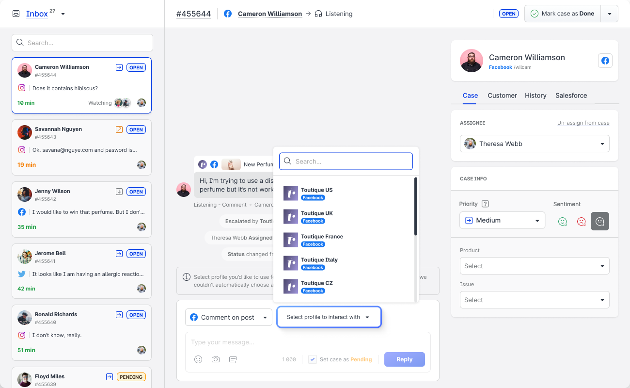 For cases that came to Community from listening queries, when you are escalating such cases from Community to Care, you no longer have to specify the profile from which an agent will be communicating in this case in Care.