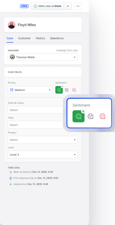 In Care, the sentiment (positive, neutral, negative) is now assigned to each new case automatically.