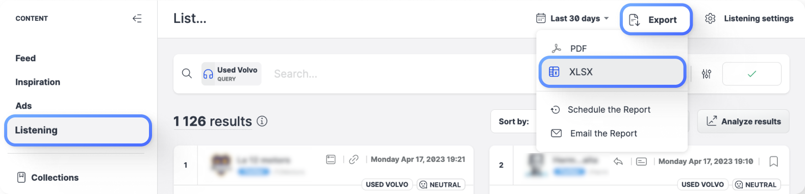 To export listening content to XLSX, go to Content, and click Listening. Configure your search query, and then click Export -> XLSX.