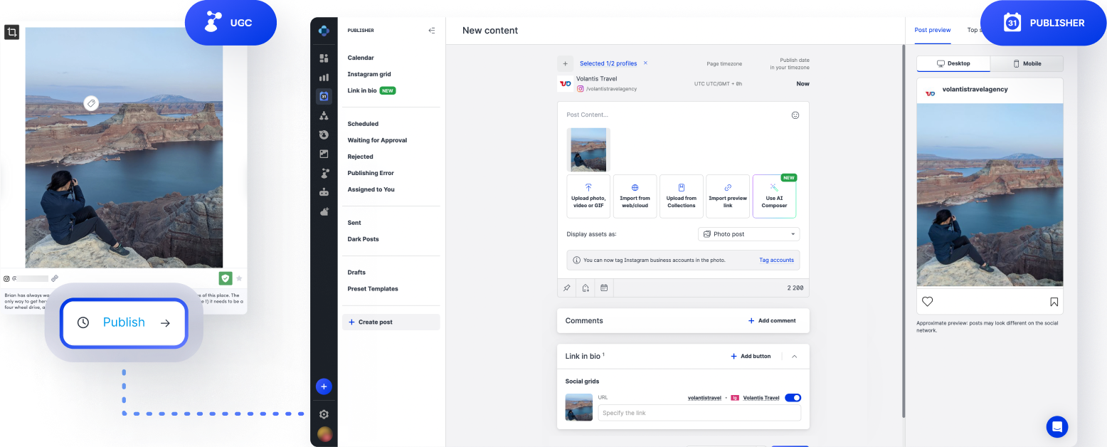 If you use the UGC module to manage user-generated content (UGC), you can now publish the content via Publisher and use all Publisher’s features and capabilities such as PrimeTime scheduling (see Scheduling Options), using AI Composer (see AI Composer), publishing to multiple social media profiles, adding labels, and so on.