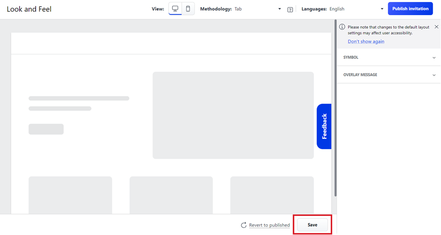 When you create an invitation using the Tab methodology, you will find a new Save button at the bottom of the Look and Feel page. You now have the ability to save the invitation configuration before you publish. If you attempt to leave the page without saving your changes, a confirmation message will display to confirm you want to leave without saving. You will also receive a confirmation message when you attempt to change to another type of Methodology.