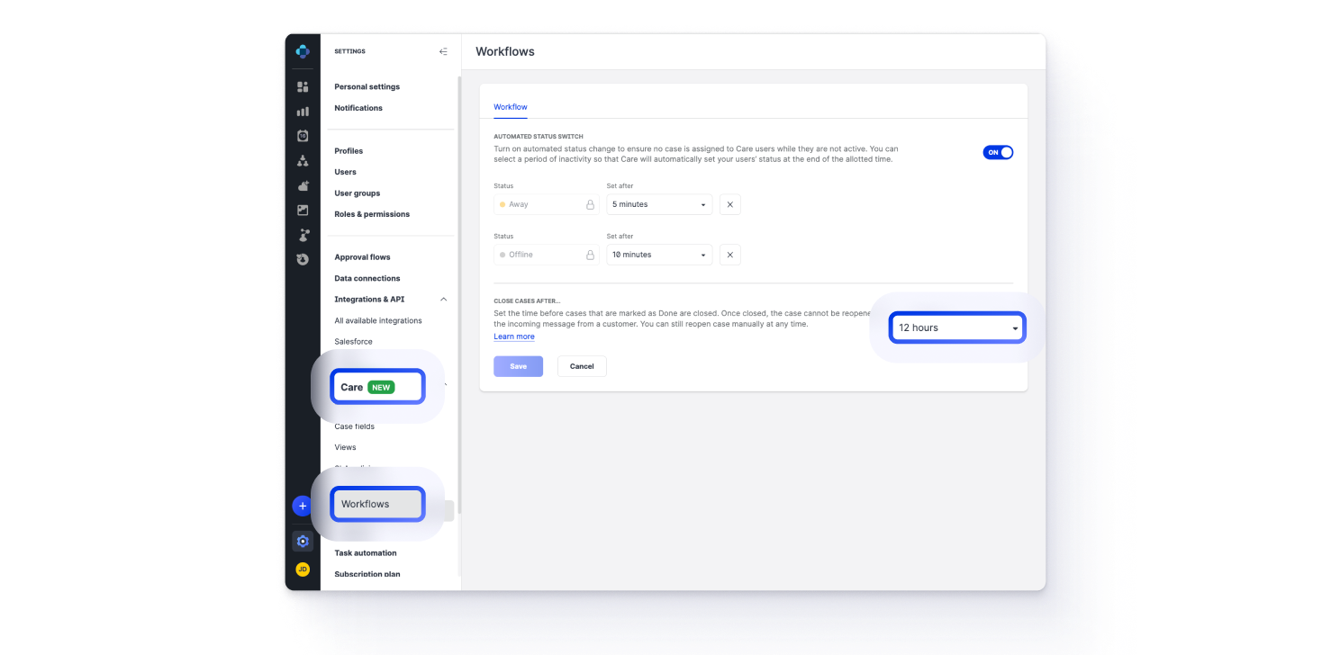 In Care, you can now customize the length of the grace period for closed cases based on your business requirements.