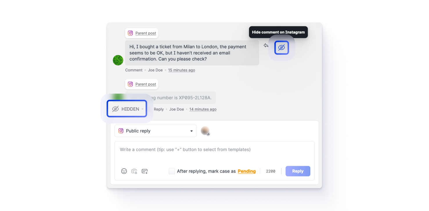 On Facebook or Instagram, the comment is no longer visible to any users except for you (as the owner of the Facebook/Instagram account) and the author of the message. The author is not informed about hiding the comment and can post replies to the comment; however, the replies will not be visible on Facebook or Instagram.