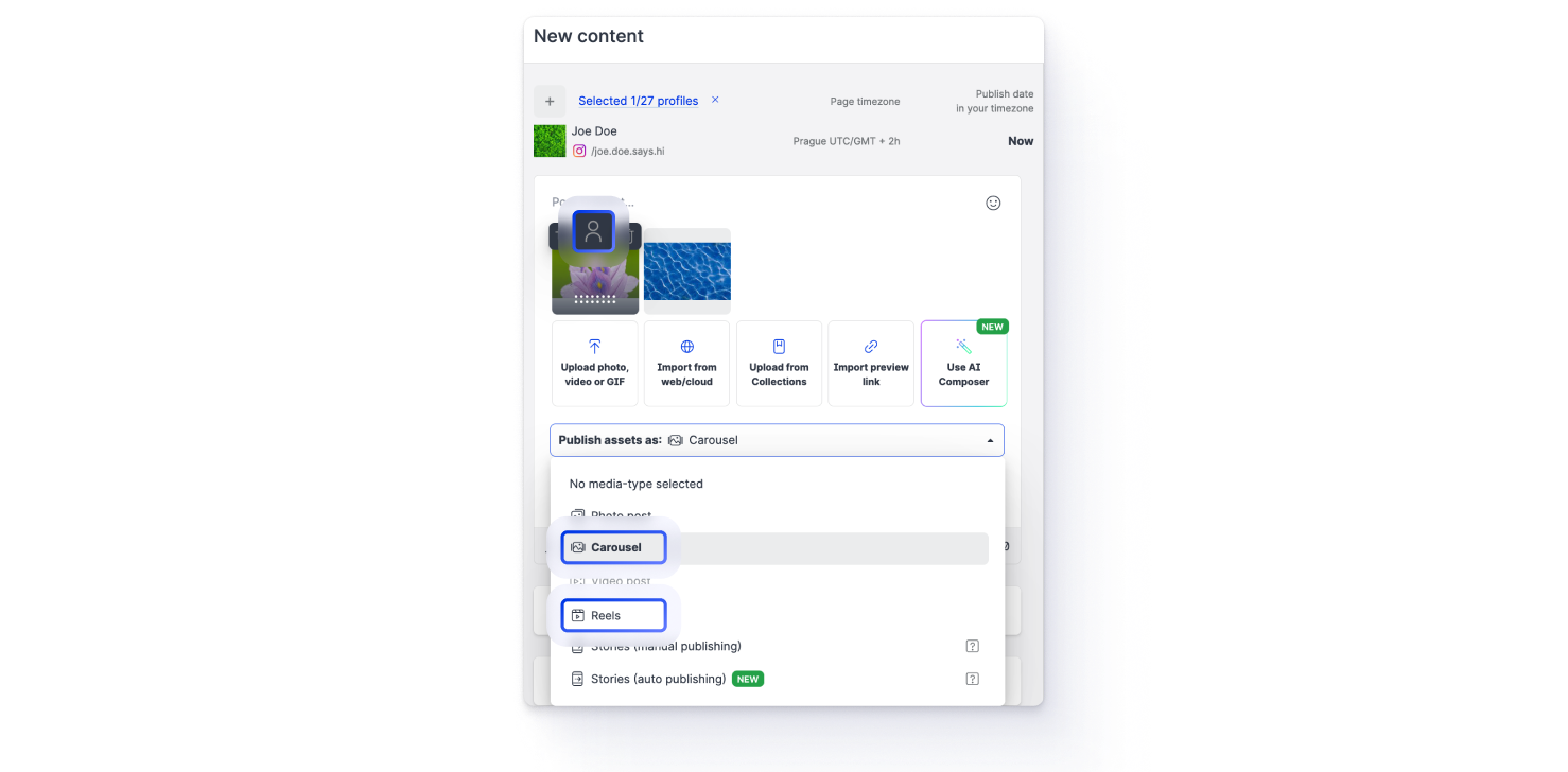 To tag Instagram users, hover over the asset that you want to post in a reel or carousel, and click the tag icon.