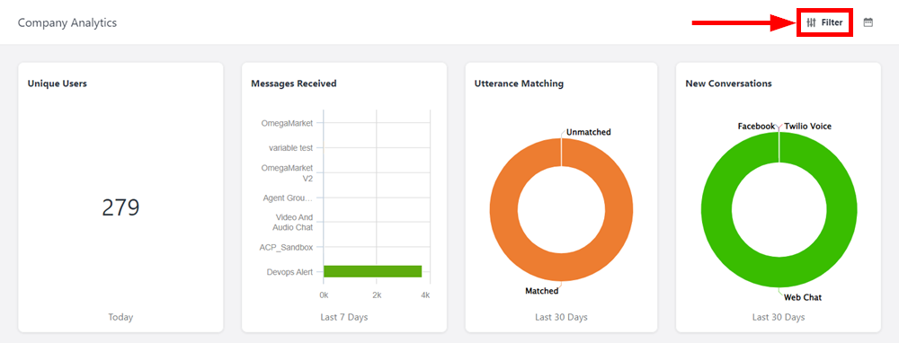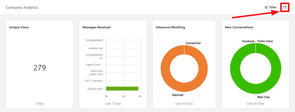 The Analytics Dashboard provides detailed statistical reports on the performance of all your company's bots. These reports allow you to determine how successfully your bots are engaging customers, and how they could be improved. You can adjust each report's display settings in order to get a more comprehensive view of the data coming in from your bots.