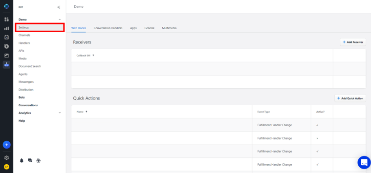 On this tab, you can add and manage the web hooks to be used by your bots. This function is now performed through application programming interfaces (APIs).Conversation Handlers