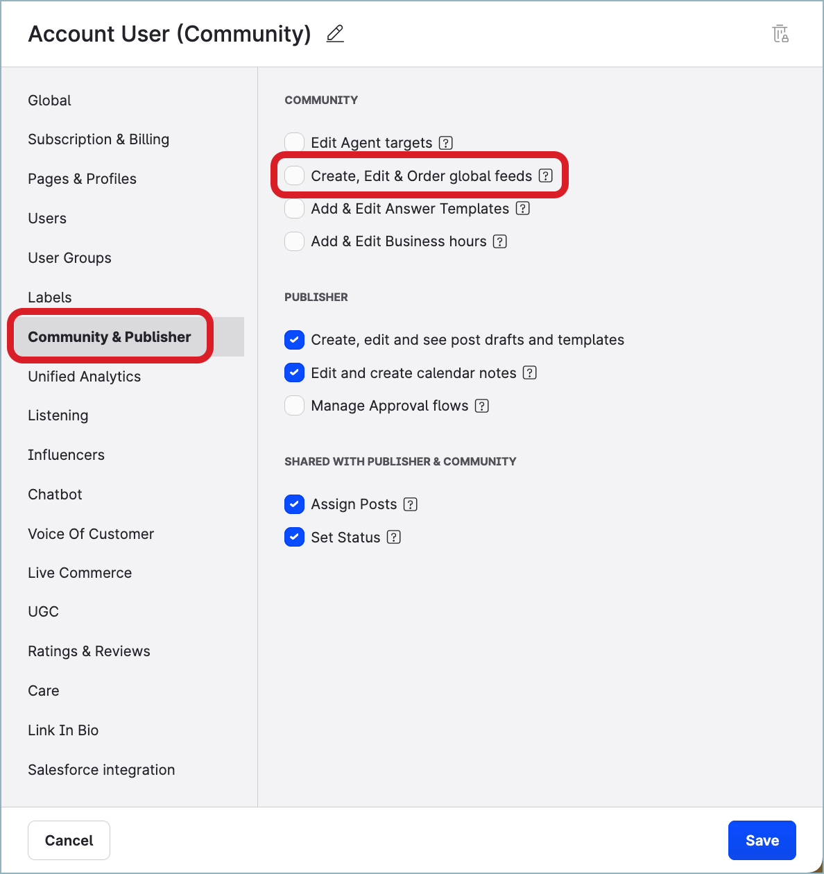 The role permission panel slides out.Click Community & Publisher, and select the checkbox Create, Edit & Order global feeds.