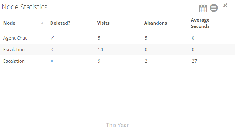 These metrics should be reviewed often to ensure that abandons or time spent is not too high - which could signal that the node is either too complicated, has too many options, or is unclear to users.