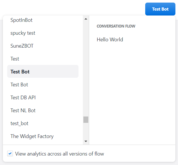 The drop-down menu contains two columns. The column on the left contains a list of your company's bots; the column on the right contains a list of the conversation flows belonging to the selected bot (this column is empty until a bot is selected).