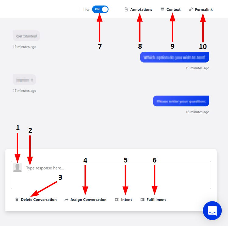 8 | Annotations | Click here to view annotations for the selected conversation. Annotations are conversation logs that appear in between messages in the conversation. These provide more detail on the decisions being made and rules being matched by Bot in the conversation to help troubleshoot issues. |