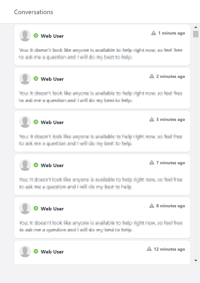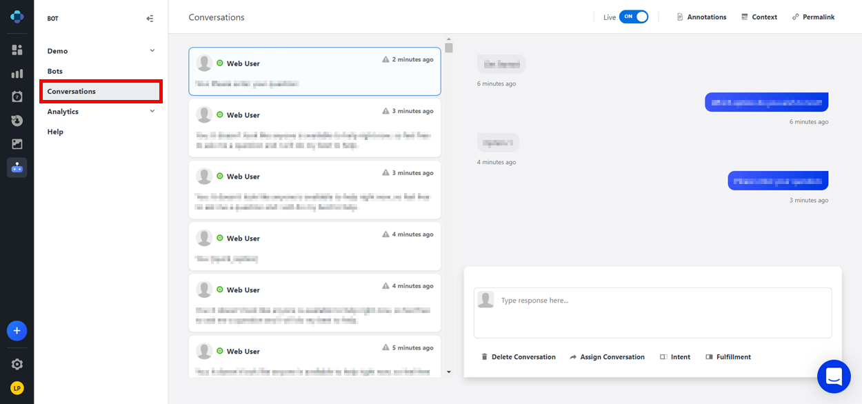 The Conversations page allows you to view every conversation taking place between users and your bots.
