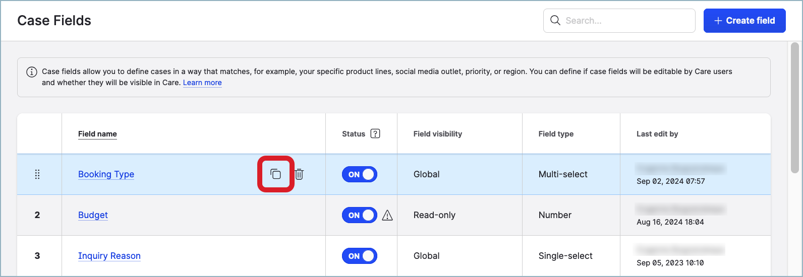 and any of recommended case fields in the case are not filled in, you will be advised to fill in these fields first (see Change the Status of a Care Case).If the duplicated field is of the Single-select or Multi-select type, review and update the available values that a Care user can set the case field to.