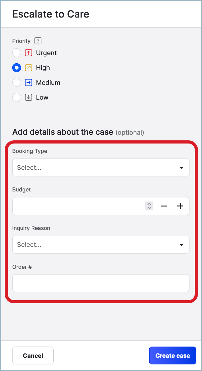 The fields will also be available on the panel for escalating from Community to Care (see Escalate a Community Message to Care):
