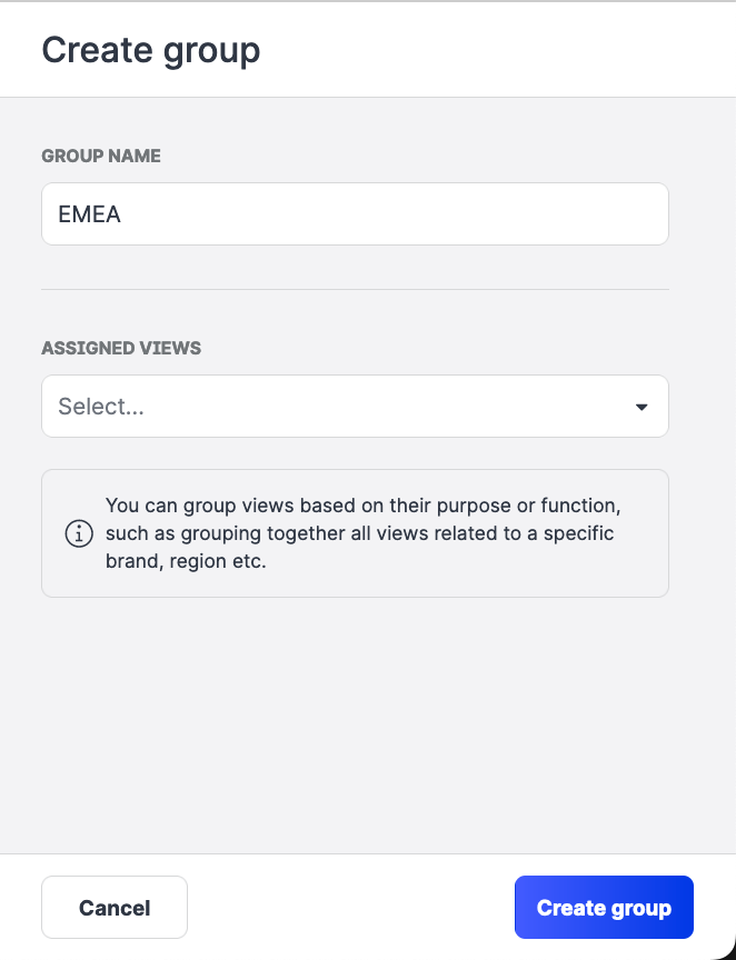 Click the Assigned views dropdown, select one or more views to include in the group, and click Apply.
