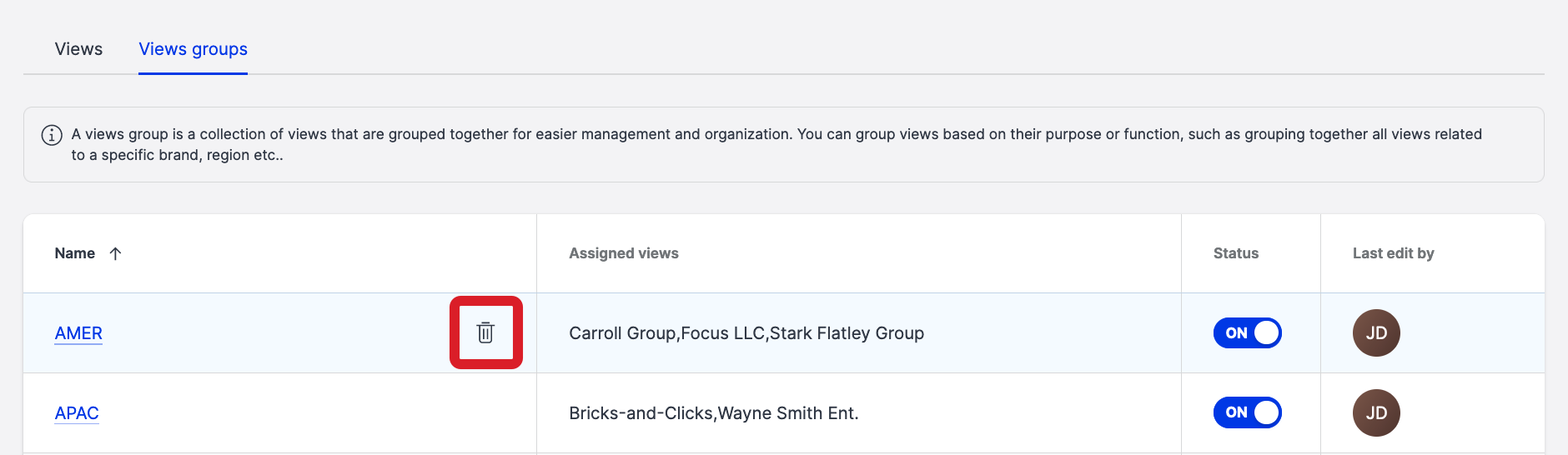 Hover over the view group that you want to delete, and click the trash can icon that appears.