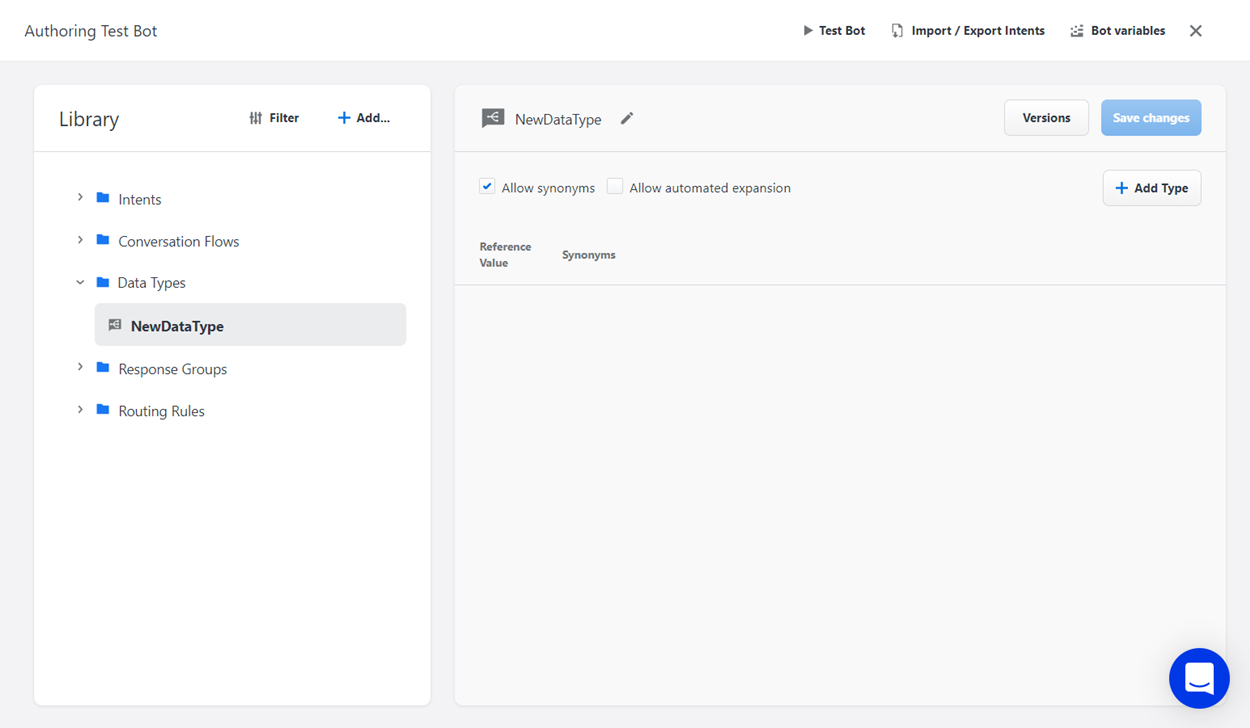 On the Bot Authoring page, you can create data types to configure how data from user messages in bot conversations is detected and stored in the Bot system. A data type consists of a reference value, which is a definable category into which elements of a user message may fall.