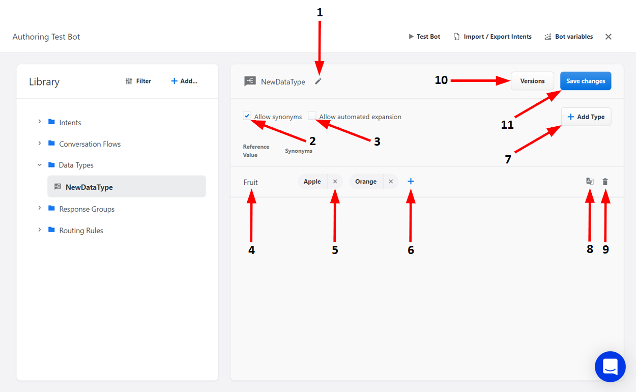 6 | Add Synonym | Click here to add a synonym to the reference value. When a synonym occurs in a bot conversation, it is treated as an occurrence of the corresponding reference value. When you are finished typing, click Enter to save the synonym.