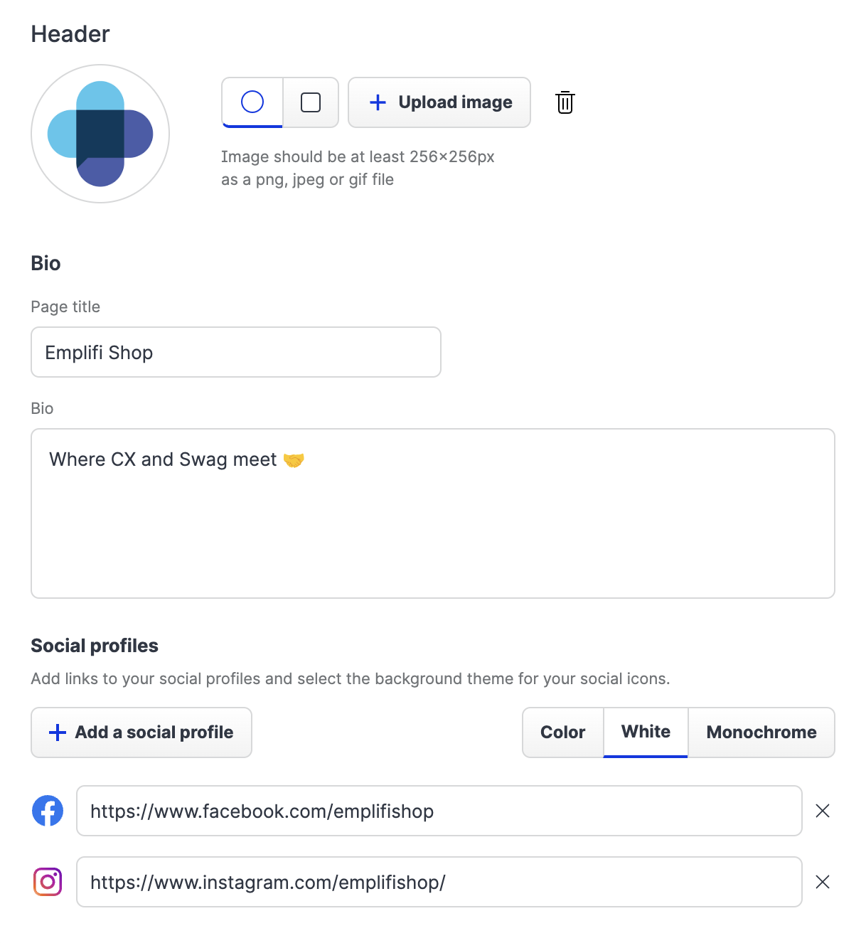 Change the header image, bio, and choose which social profiles you want to connect.