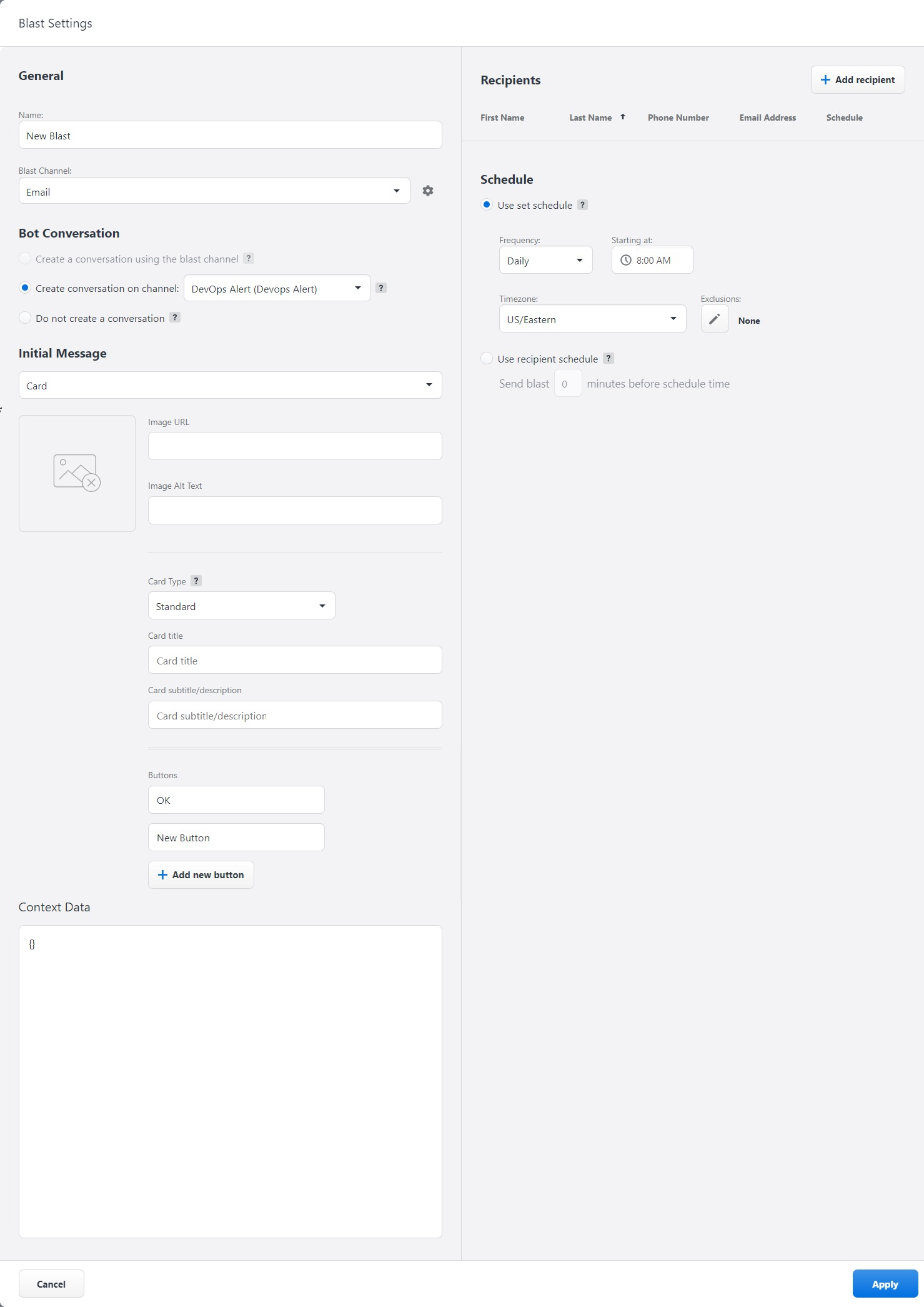 Context Data: Use this field to assign initial values to variables in the bot conversation created by the blast. For more information, see the "Configuring Data Context" section below.