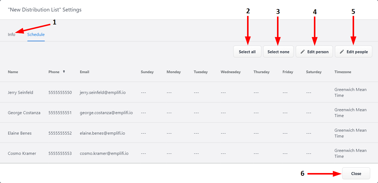 5 | Edit People | After selecting multiple people from the list, click here to edit their schedule information and time zone. |