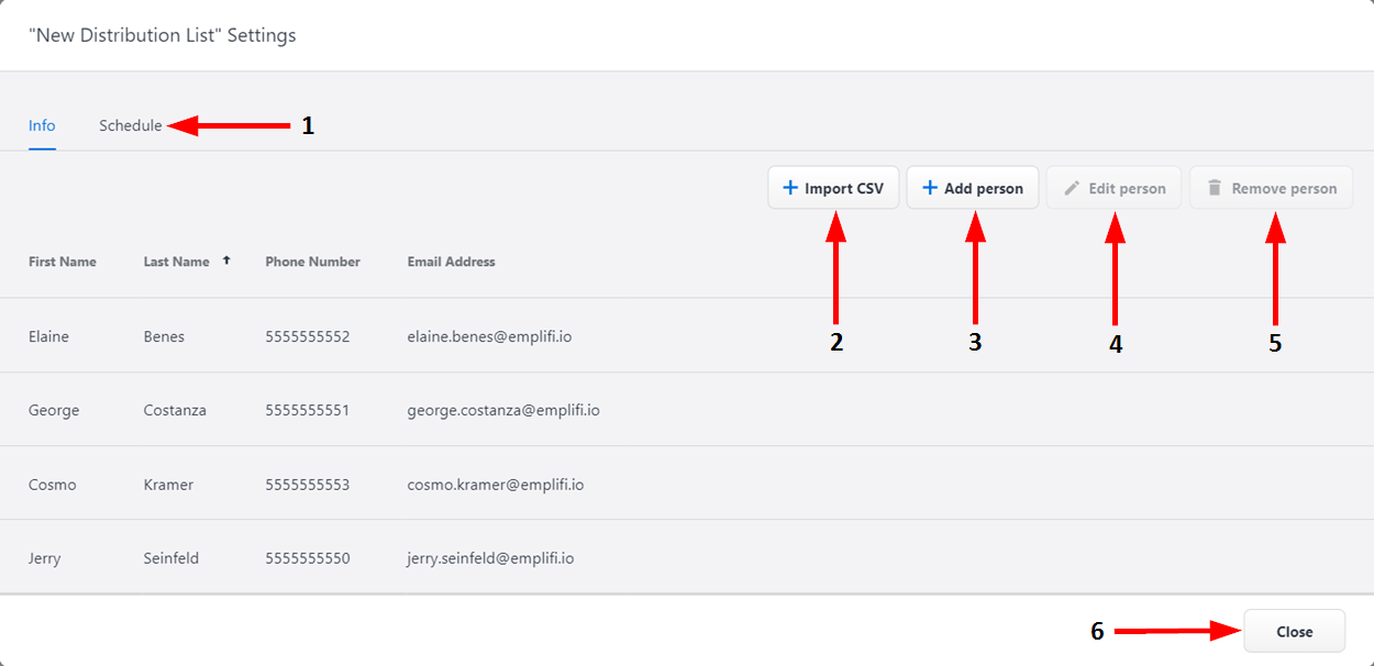 4 | Edit Person | After selecting a person from the list, click here to edit the information associated with them (first name, last name, phone number, email address, etc.). |