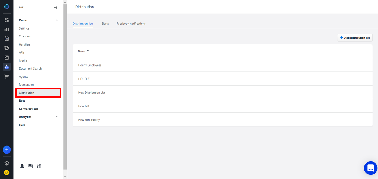 On the Distribution page, you can configure outgoing SMS or email "blasts" to a predefined group of users. These blasts can be used to prompt the recipients to interact with the bot on a regular basis, or just for announcements.