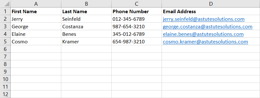 At the top of the first four columns, create four headers in the following order, from left to right: First Name, Last Name, Phone Number, and Email Address.