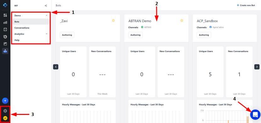 The Bot Card displays analytic information about its corresponding bot and contains buttons for configuring the bot, including the Authoring (pencil) button.