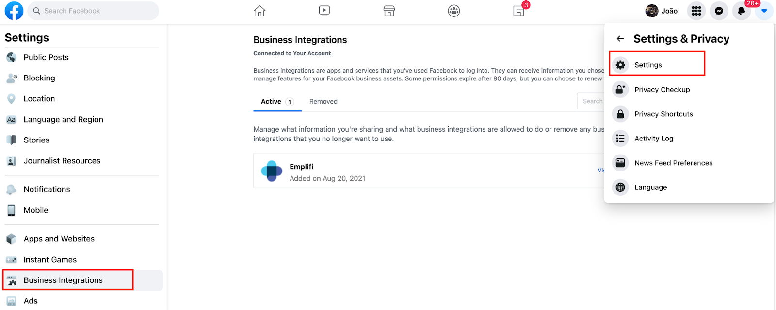 Go to your Facebook Profile Settings & Privacy → Settings and click on Business Integrations.