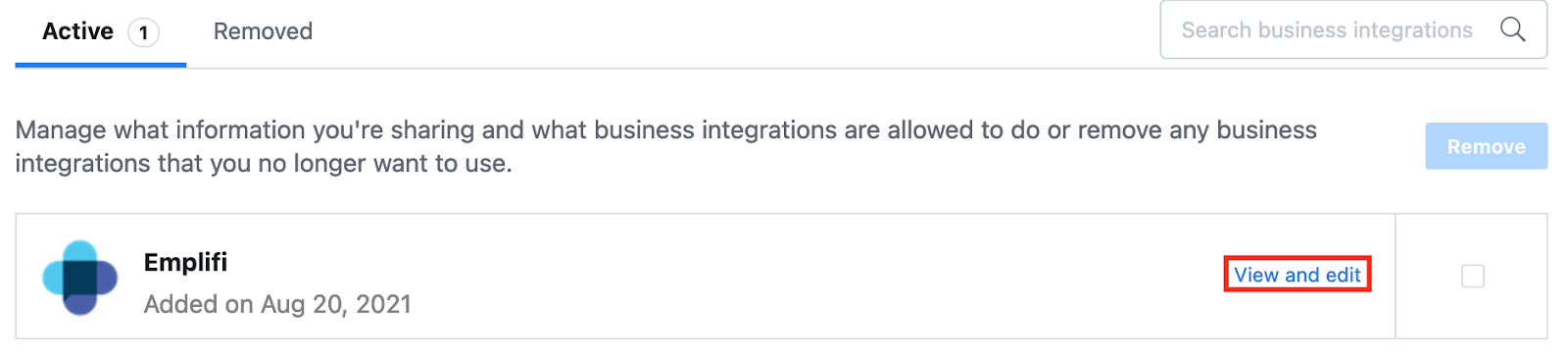Check the active business integrations and click View and edit on Emplifi business connection.
