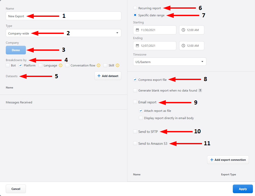 3 | Company / Bot / Flow / Group | Click here to select the company, bot, conversation flow, or agent group included in the report generated by the export (depending on your selection of report type). |