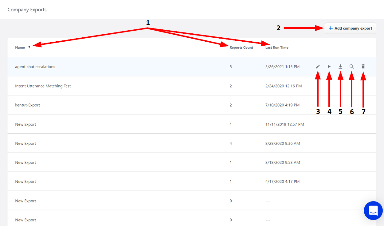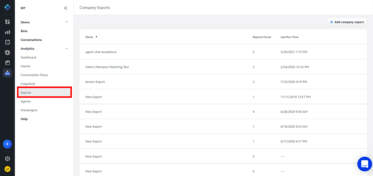 The Company Exports page allows you to set up, schedule, and generate analytic reports that are emailed to specified company users on a regular basis. These reports can include data from all your company's bots, or from specific bots, conversation flows, or agent groups.