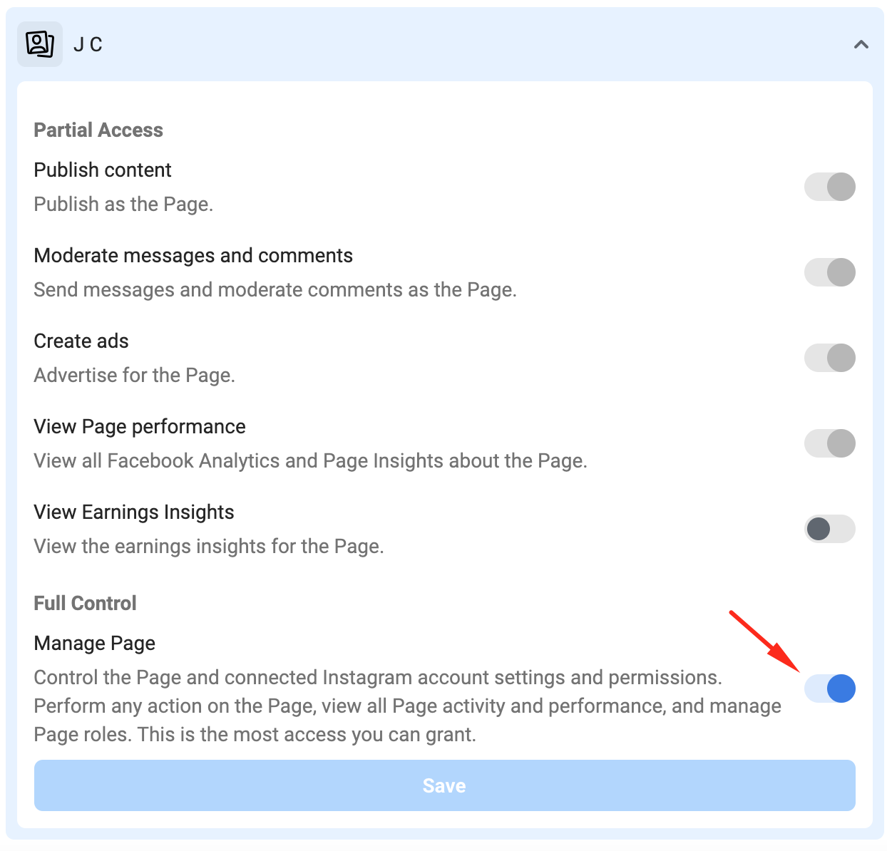 To grant the user with Admin Role over a Facebook Page, simply tick the Manage Page option as shown in the image below.