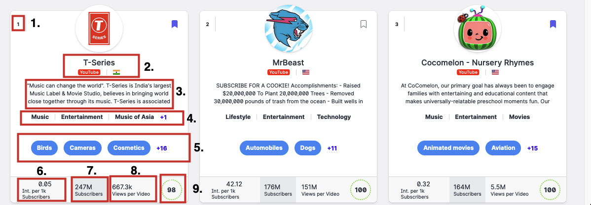 You can click any channel profile card to see more data about the channel. To learn more, see YouTube Profile Details.
