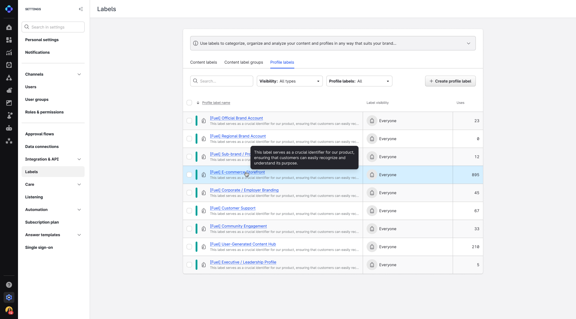 Fuel uses system labels (prefixed with [Fuel]) to connect your objectives, automations, and data together. You can find Fuel labels in Settings → Labels → Profile labels.