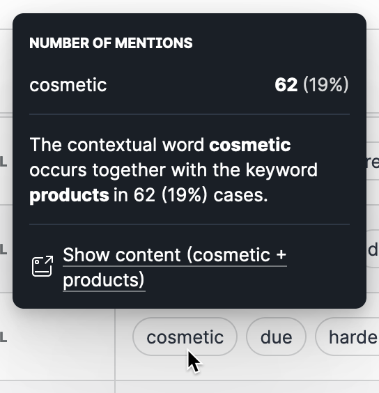 Hover over a keyword to see detailed information about it and the link that opens it in the Content module.