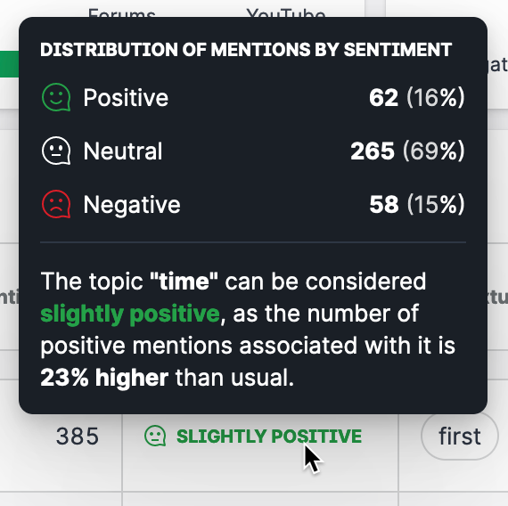 Hover over a topic’s sentiment to see the distribution of individual mentions' sentiments explaining the calculation behind it.