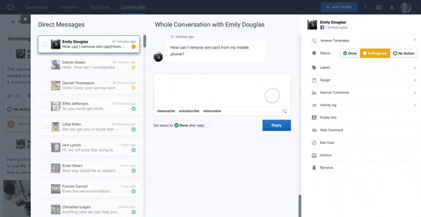 Internal cues and notifications are key to streamline team collaboration. Assignments ensure that no two managers are working on the same message at once. To further communicate the status of an assignment, users can mark posts as done, in progress, or no action. Posts can be filtered by their status so that you can see how your community is managing its workload.