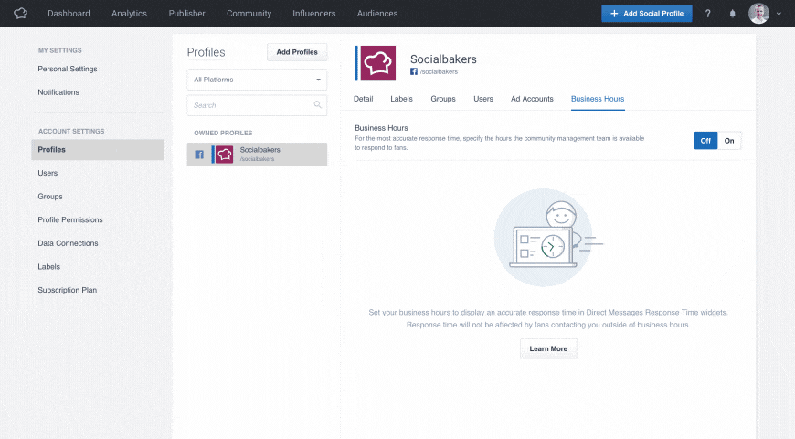 By setting specific business hours and holidays for your profiles, you can be more accurate in your community reporting. The response times for your team will be measured and reported on only for these specific time ranges. This will give you a more accurate insight into your ability to respond to your fans. For those teams that are running 24/7, there’s no need to set business hours. Learn how to set your business hours in just a few steps (see Analyze Performance of Your Community Operations).
