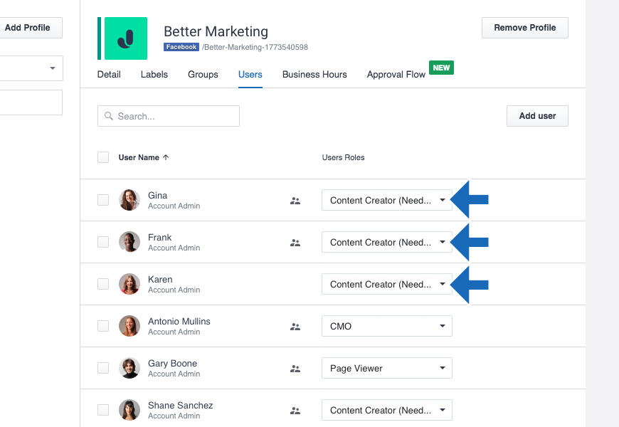 In this case, Better Marketing needs to assign the content creators, Gina, Frank, and Karen with the ‘Content Creator (Needs Approval)’ role in the Profiles section of Settings.