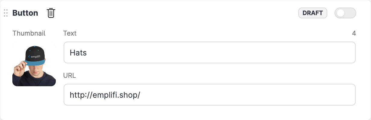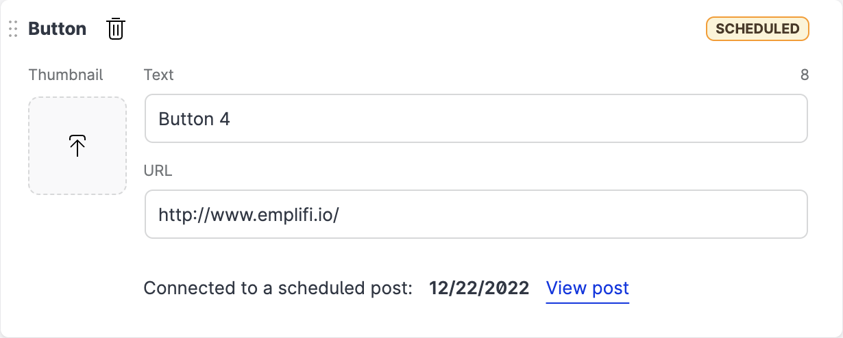 In Publisher, you can only create a plain text button without a thumbnail. To create a button with a thumbnail, use the Emplifi Link module. See Configure Your Link in Bio Page.