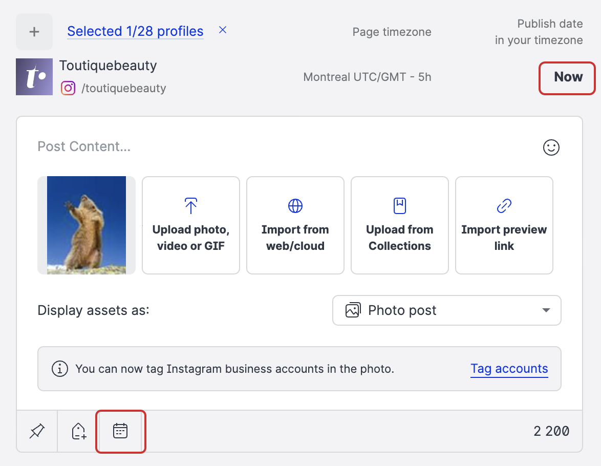 To schedule the post, click the schedule icon or Now.
